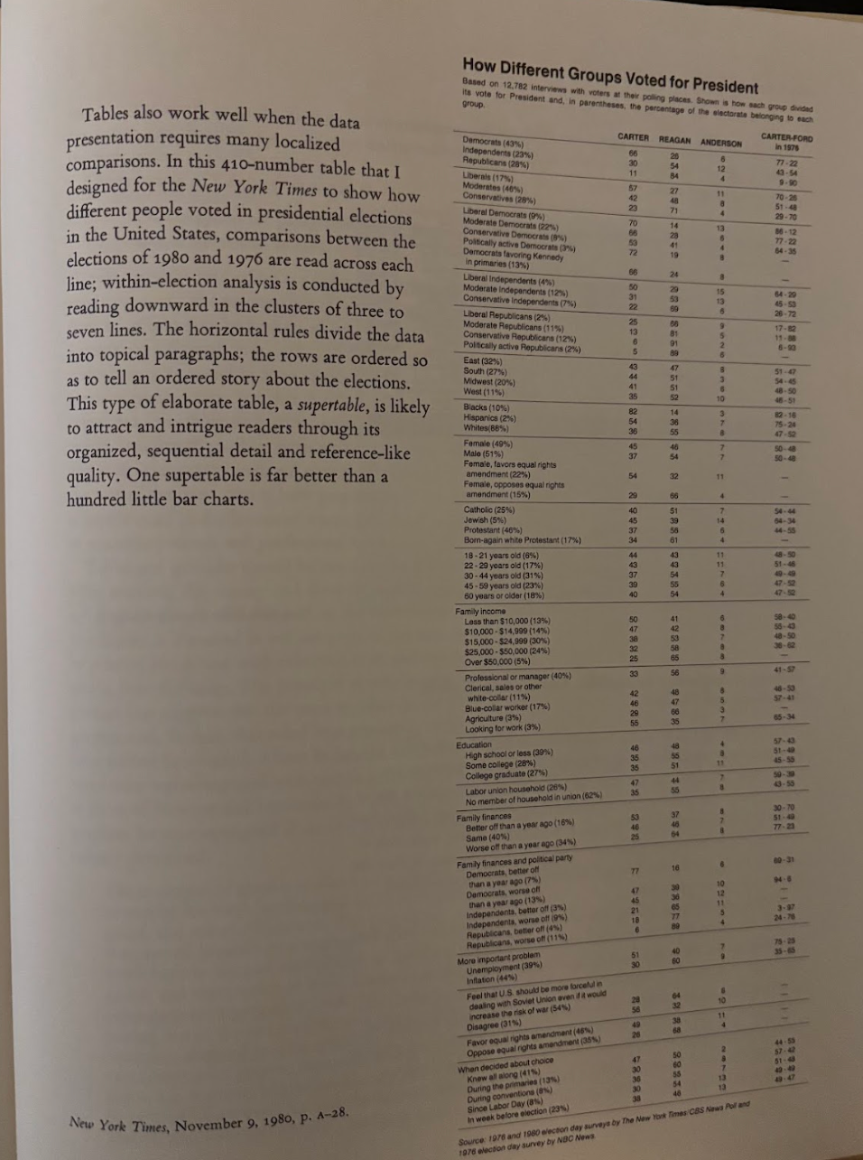 Tufte was the first writer I read who actually cared about the fact he had written a book. A book qua book, not just a series of words that happened to be printed as a book because binding paper between cardboard is an economically efficient way of delivering information. He cared about what the page size would be, and the font, and where pictures would end up in relation to each other, and how the text should work with the pictures. He pulls every formatting lever a book gives him, whitespace and color and page margins and so so so so many pictures, to deliver his message clearly.