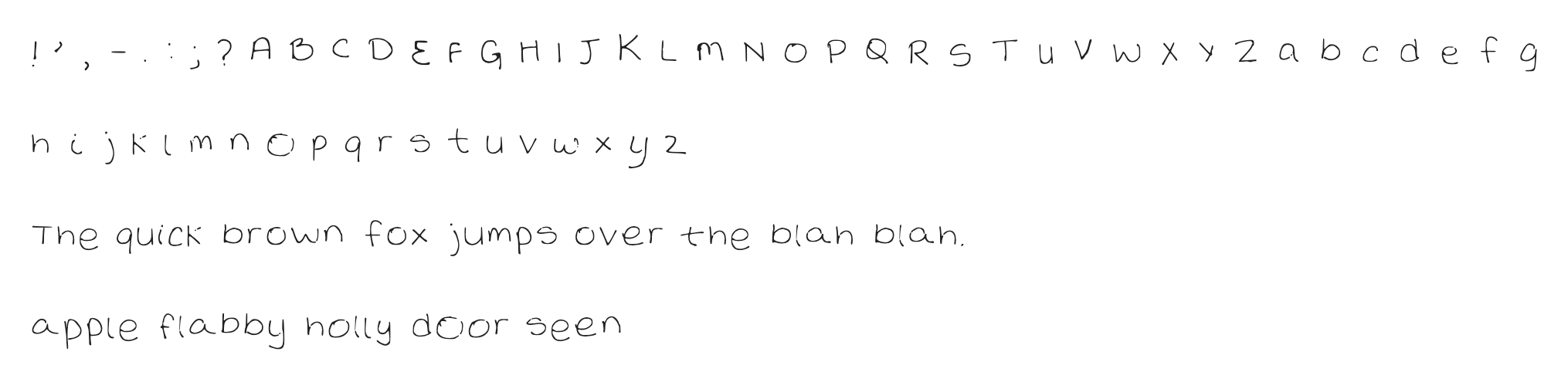 One thing I love about this is that, as you can see in the last line ("apple flabby..."), the same letter can have different forms (e.g., the two p's in "apple" look different from each other). This makes the resulting words seem more handwritten.